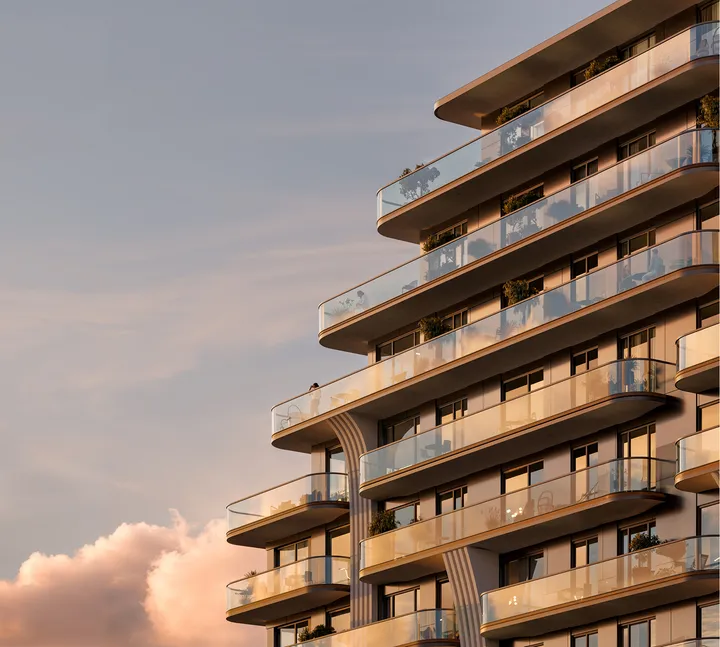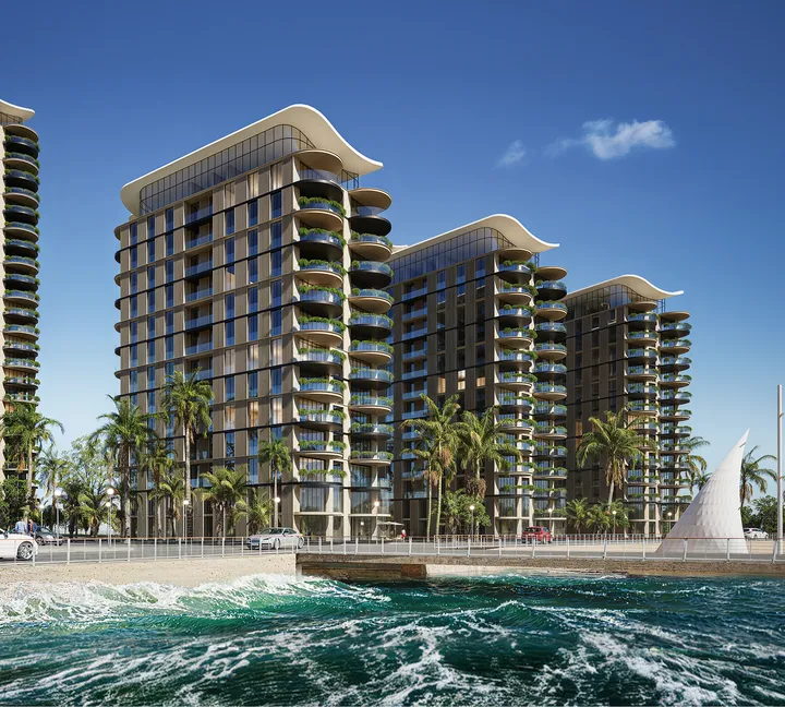 Премиальный жилой комплекс с декором фасада, вдохновленным морскими волнами, словно обнимающими стеклянные стены. Притягательный архитектурный облик проекта разработан ведущими международными бюро Benoy и Squire & Partners.