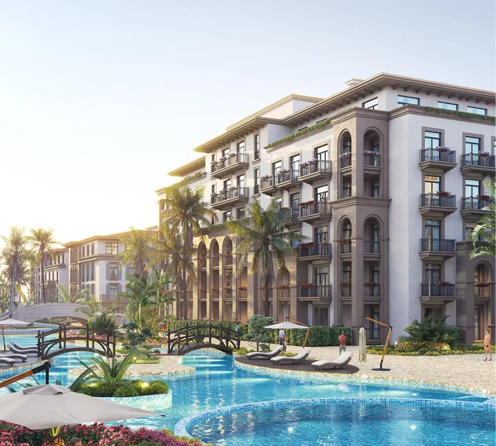Роскошный квартал в итальянском дворцовом стиле с торжественными арками, фигурными терракотовыми крышами и просторными галереями на побережье Каспийского моря. Изящные здания с фасадами в светлых тонах окружены ландшафтными садами, а бирюзовый бассейн с прозрачной водой окружают стройные ряды пальм.