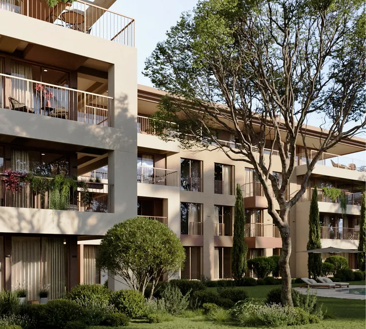Эффектный жилой квартал в стиле минимализма на морском побережье. Природные оттенки фасадов, прозрачные панорамные окна и видовые лоджии позволяют гармонично вписать современную архитектуру в приморский курортный ландшафт.
