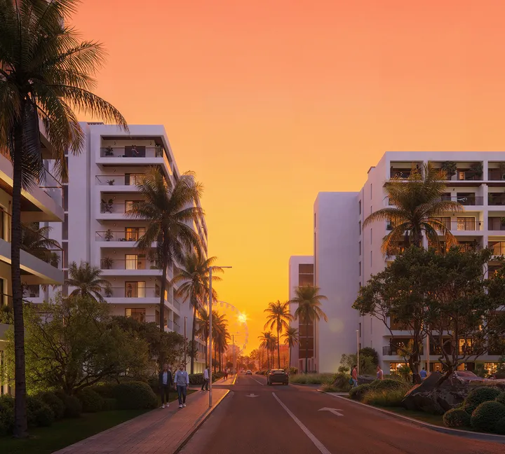 Современный жилой квартал в минималистичном стиле. Ступенчатая архитектура, лаконичные линии и прозрачные видовые лоджии. Четыре корпуса объединены зелеными бульварами с рядами шелестящих пальм и ландшафтным декором.